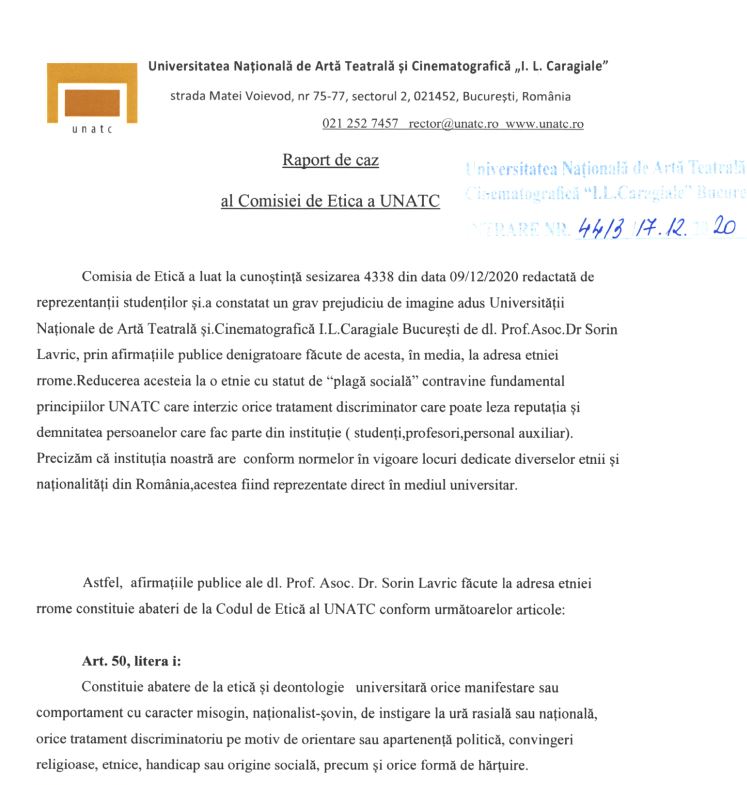 Sorin Lavric a fost „condamnat” de un raport de caz al Comisiei de Etică a instituției, care-i reproșează „un grav prejudiciu de imagine aduse Universității Naționale de Artă Teatrală și Cinematografică „I.L. Caragiale”, pentru afirmațiile făcute de acesta, la adresa etniei rome.