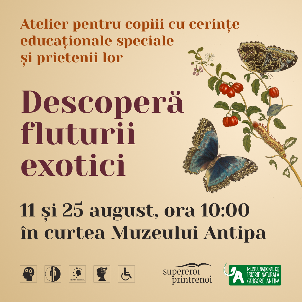 În data de 25 august, între 10- 11.15 organizăm atelierele incluzive „Descoperă fluturii exotici” din sera din curtea Muzeului, pentru copiii cu cerințe educaționale speciale și prietenii lor.